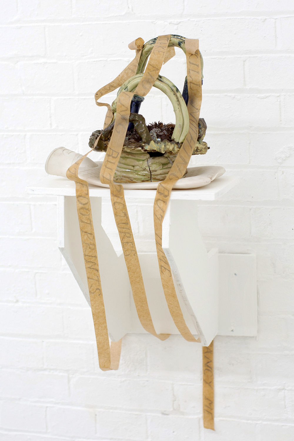 Rose Sevink-Johnston, Leave nothing but footprints, take nothing but pictures,kill nothing but time. Ceramic, beads, conker shells, hot water bottle, maskingtape, graphite.