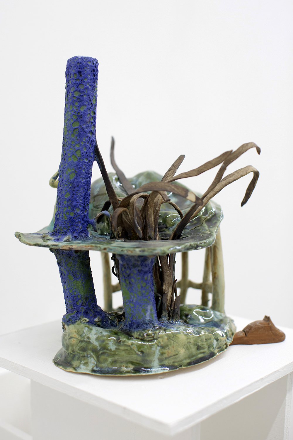 Rose Sevink-Johnston, Pond. Ceramic, dandelions, glitter, cotton, teabags, thread,chewing gum.